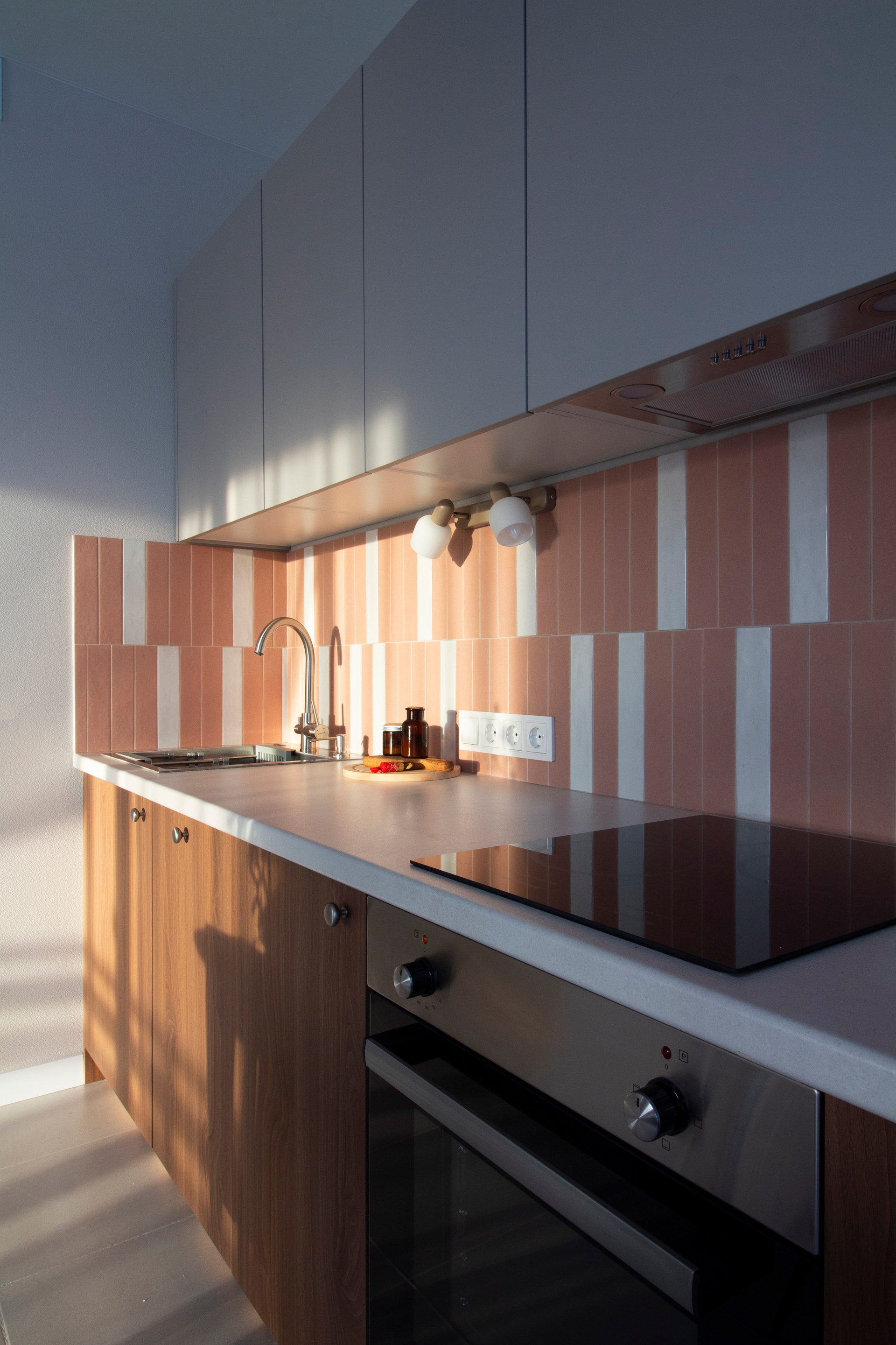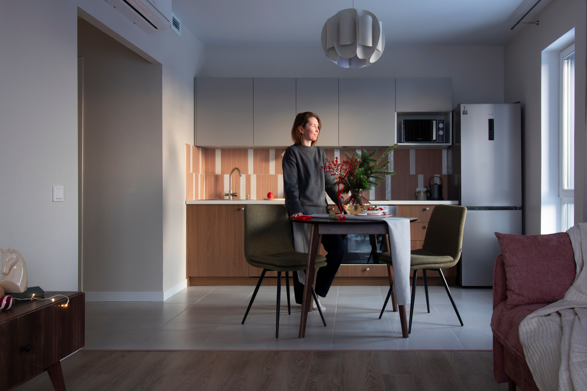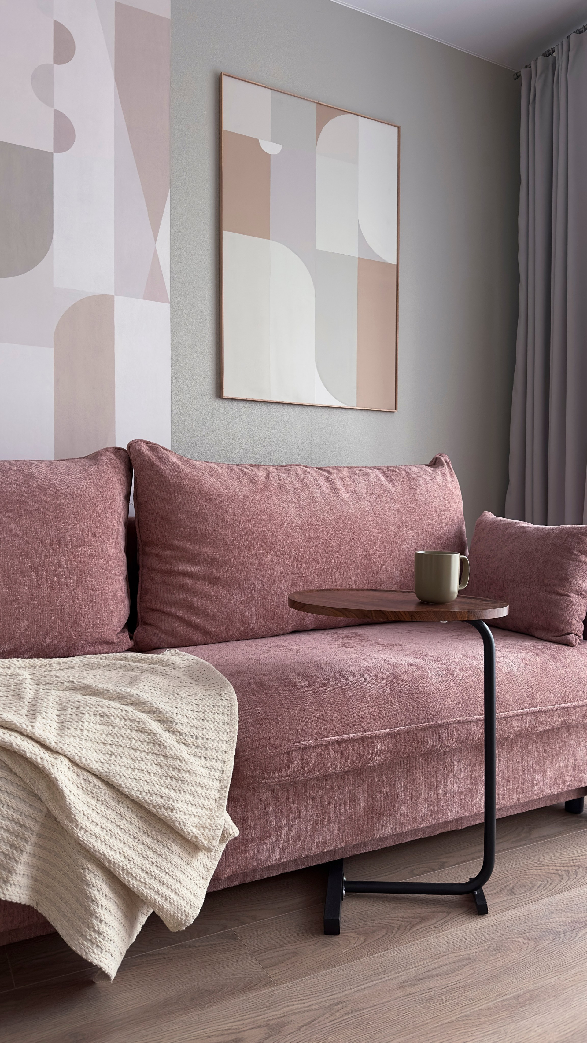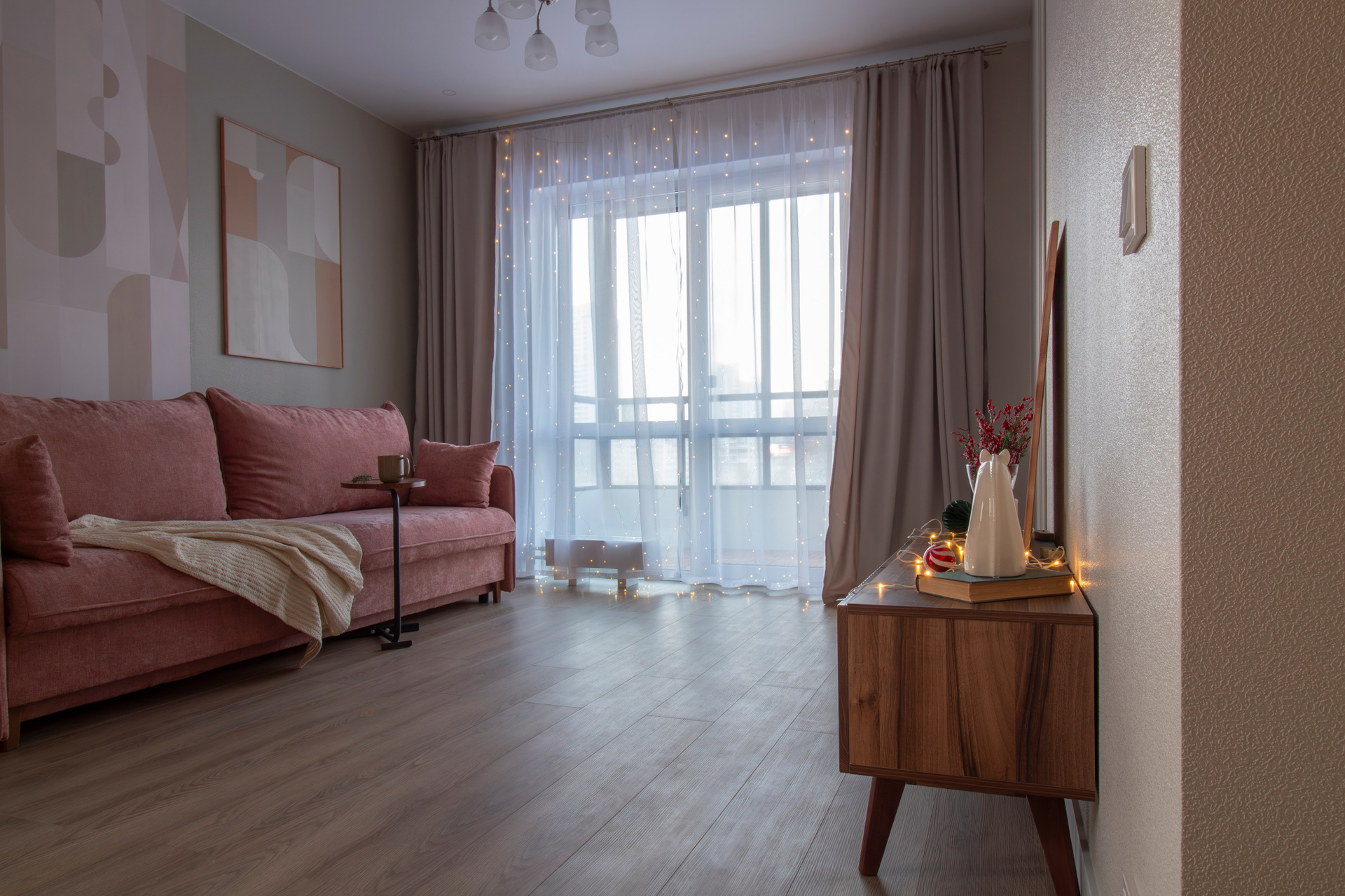Акцентные фотообои, спокойный цвет покраски стен, розовый диван и играющий красками на солнце фартук кухонного гарнитура.
