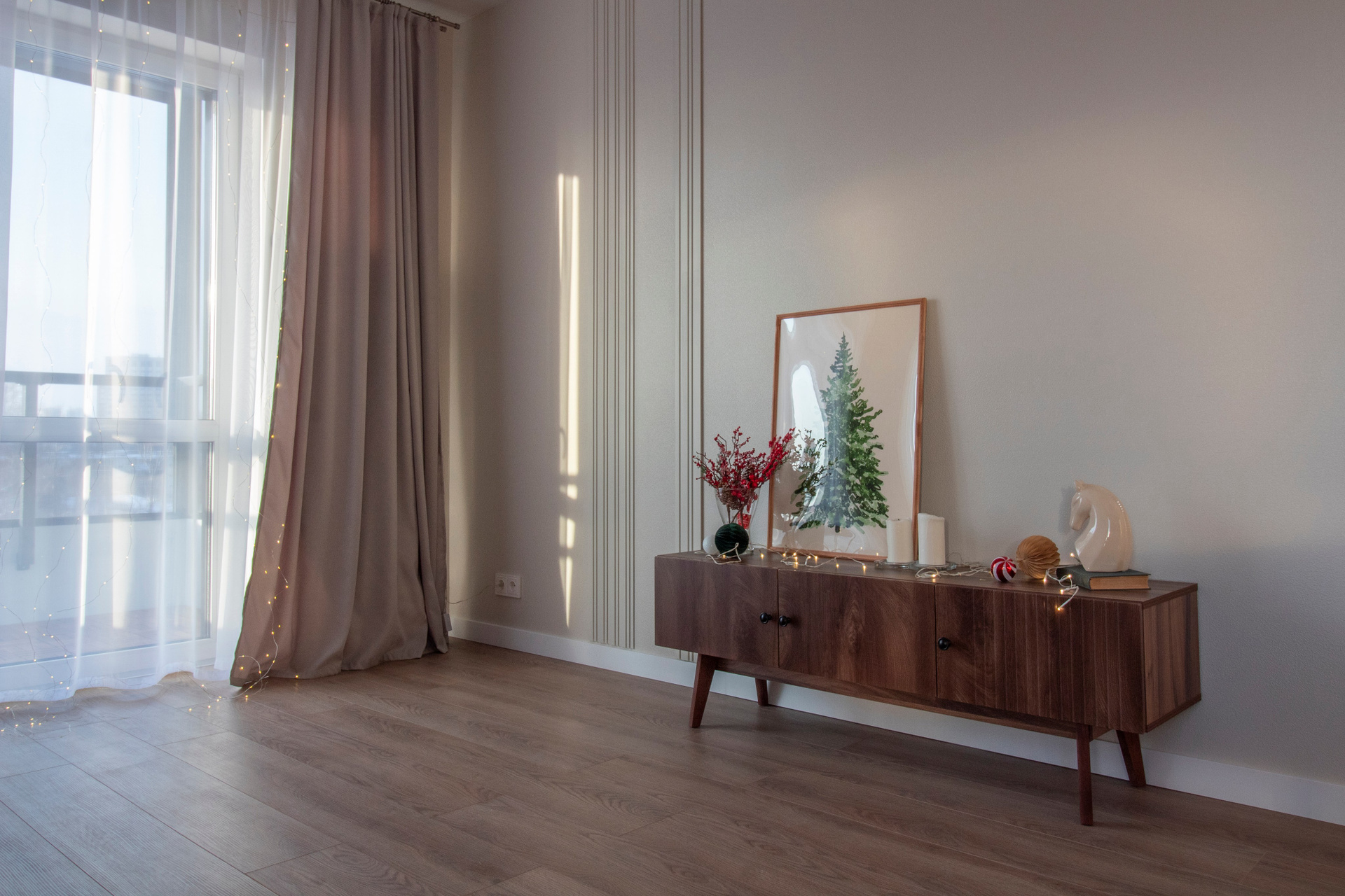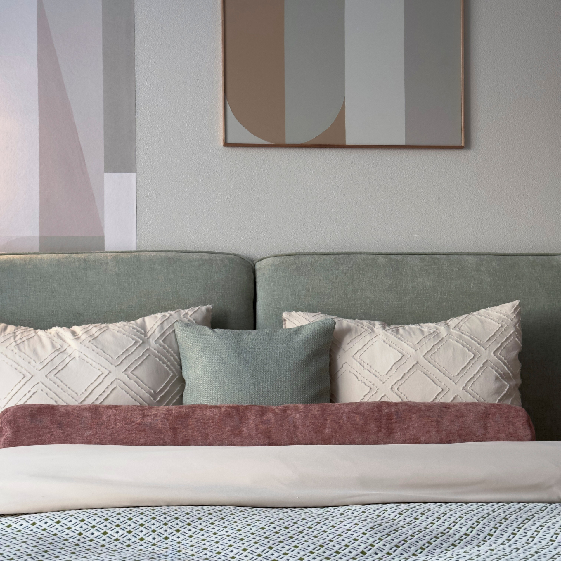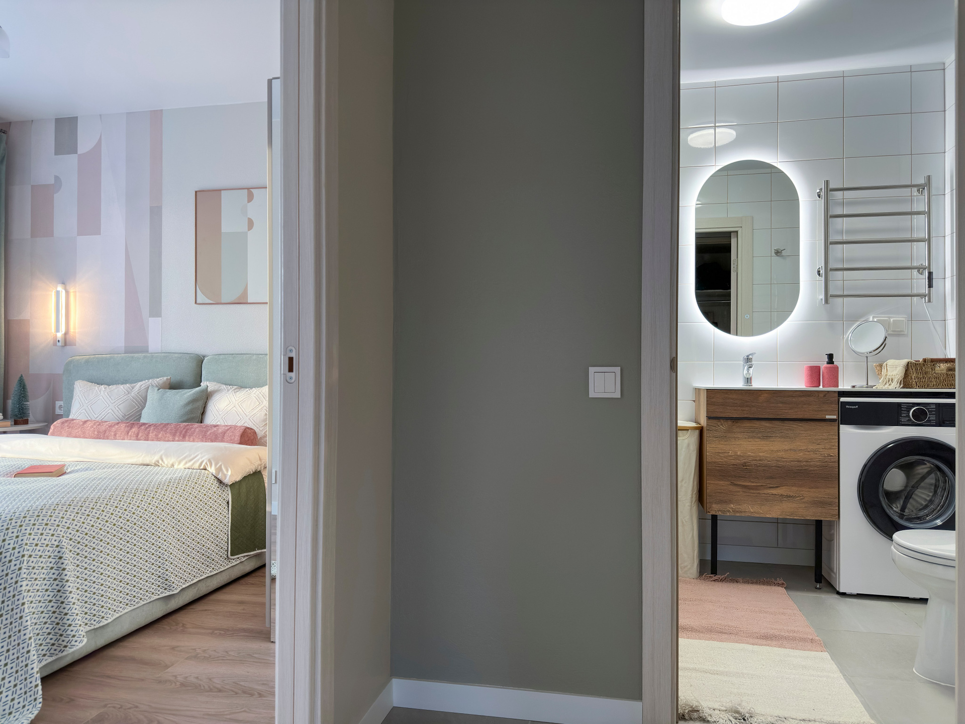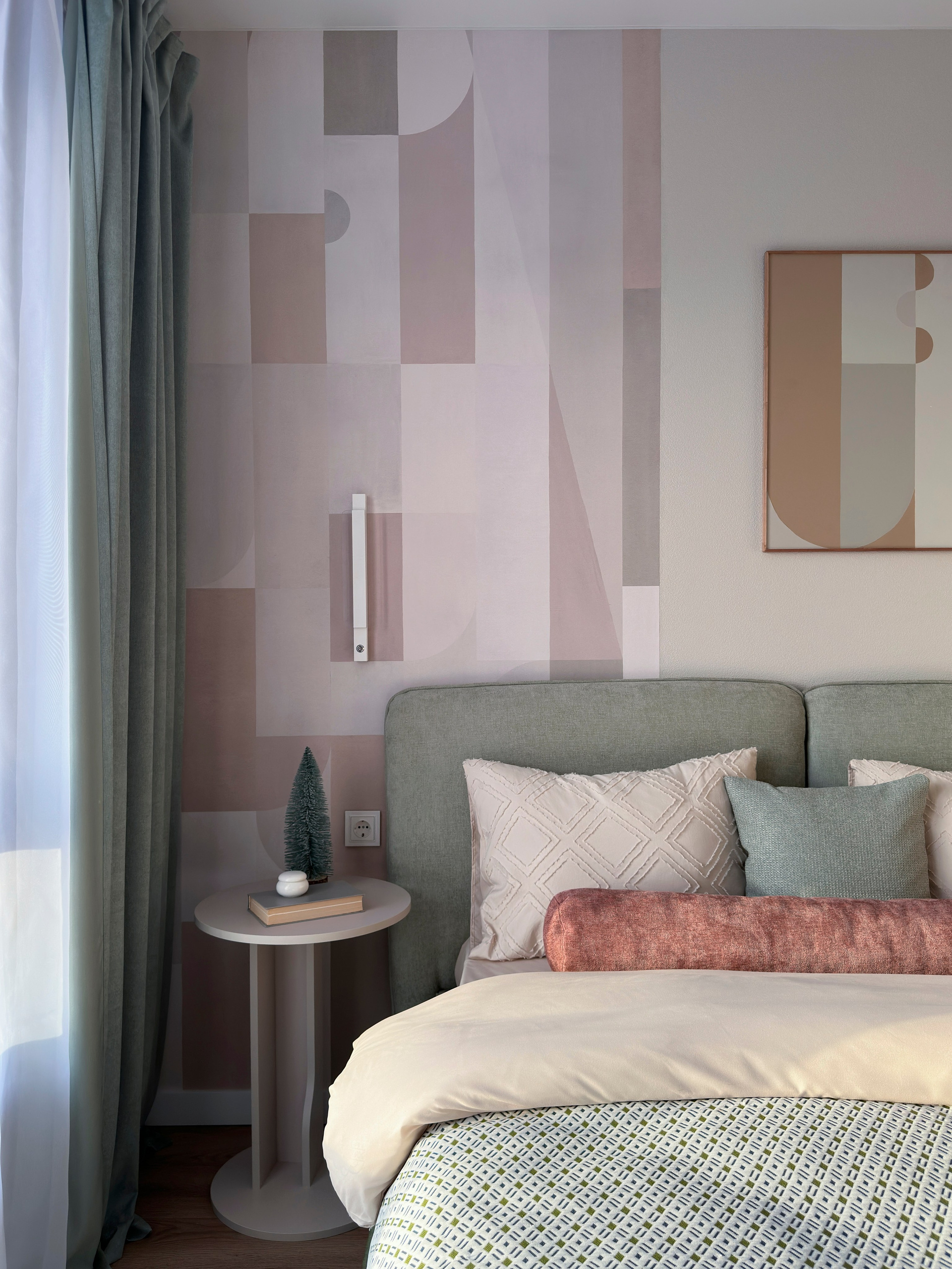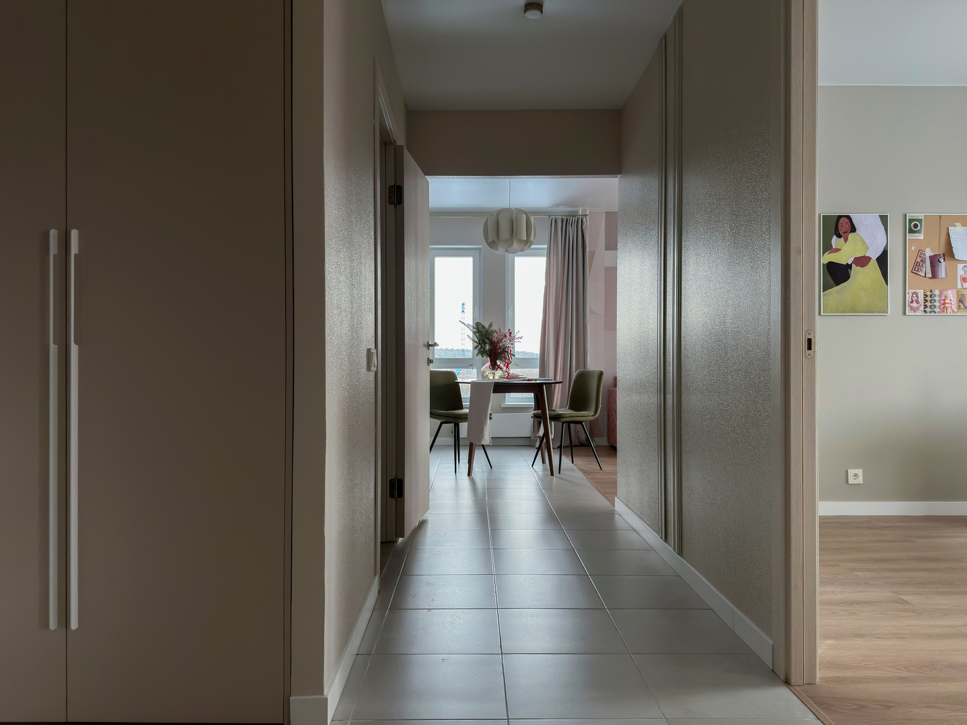 Акцентные фотообои, спокойный цвет покраски стен, розовый диван и играющий красками на солнце фартук кухонного гарнитура.